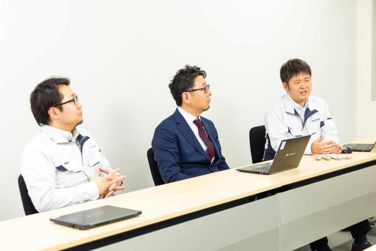 *写真右から アロカ株式会社技術本部 AS技術部 部長 谷野寿和様、技術本部 AS技術部 技術二課 技師 沢畑克樹様、技術本部 AS技術部 技術一課 技師 冨澤昌寛様