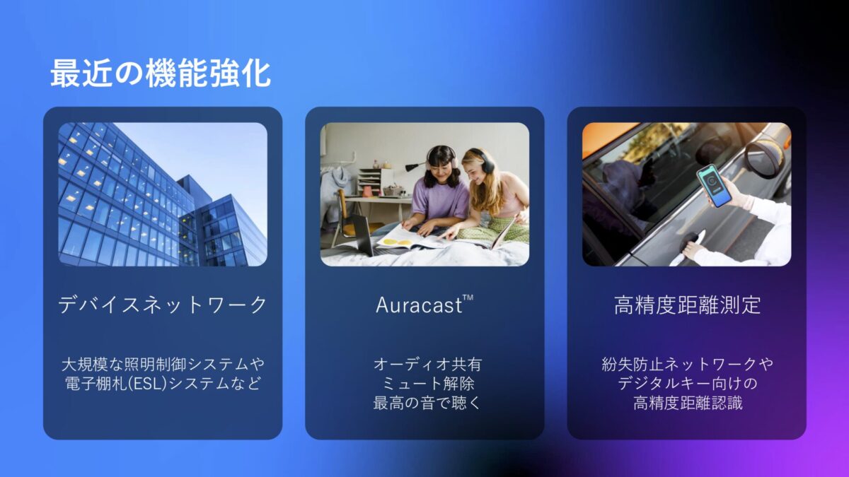 最近の機能強化について説明。ここ最近のSIG開催イベントの内容を見ても、LE Audioの拡張機能であるAuracastとチャネルサウンディングによる高精度距離測定は特に力を入れている印象。