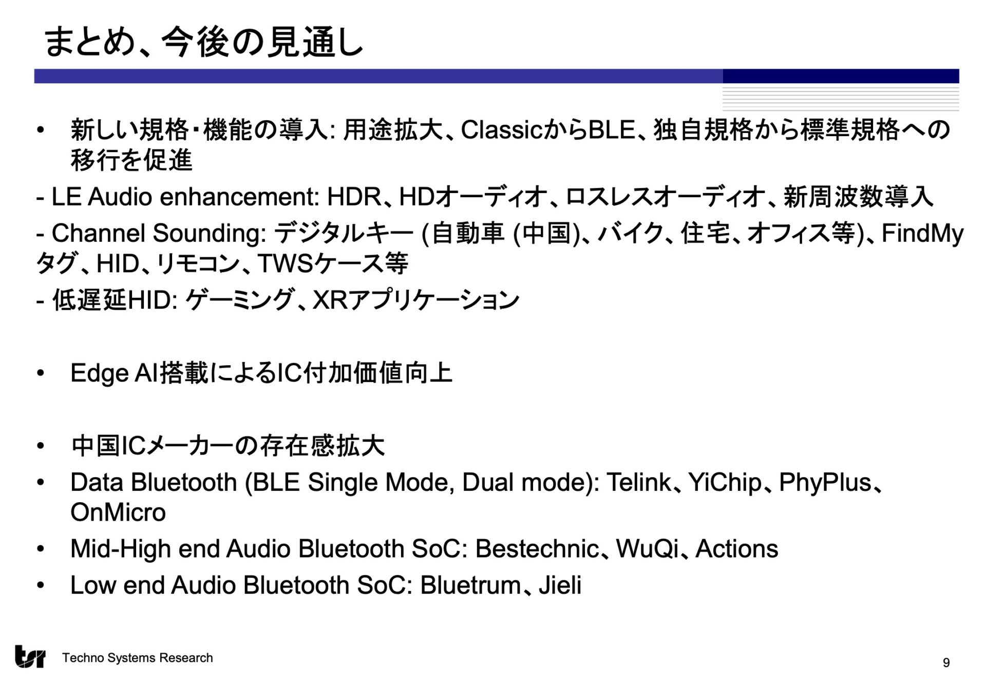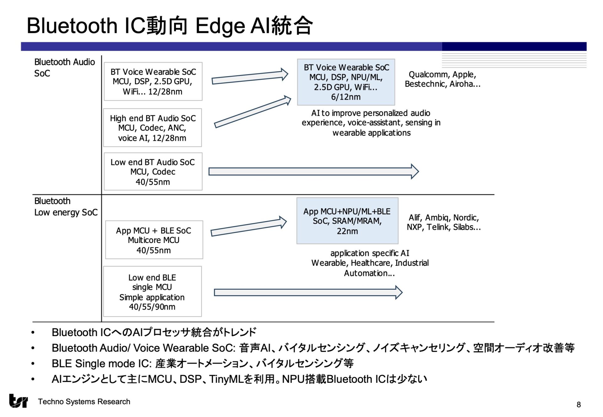 - 生成AIの普及に伴い、Bluetooth ICがAI機能を組み込む「Edge AI」がトレンドとなっており、多くのICメーカーがこの動きを強めている。