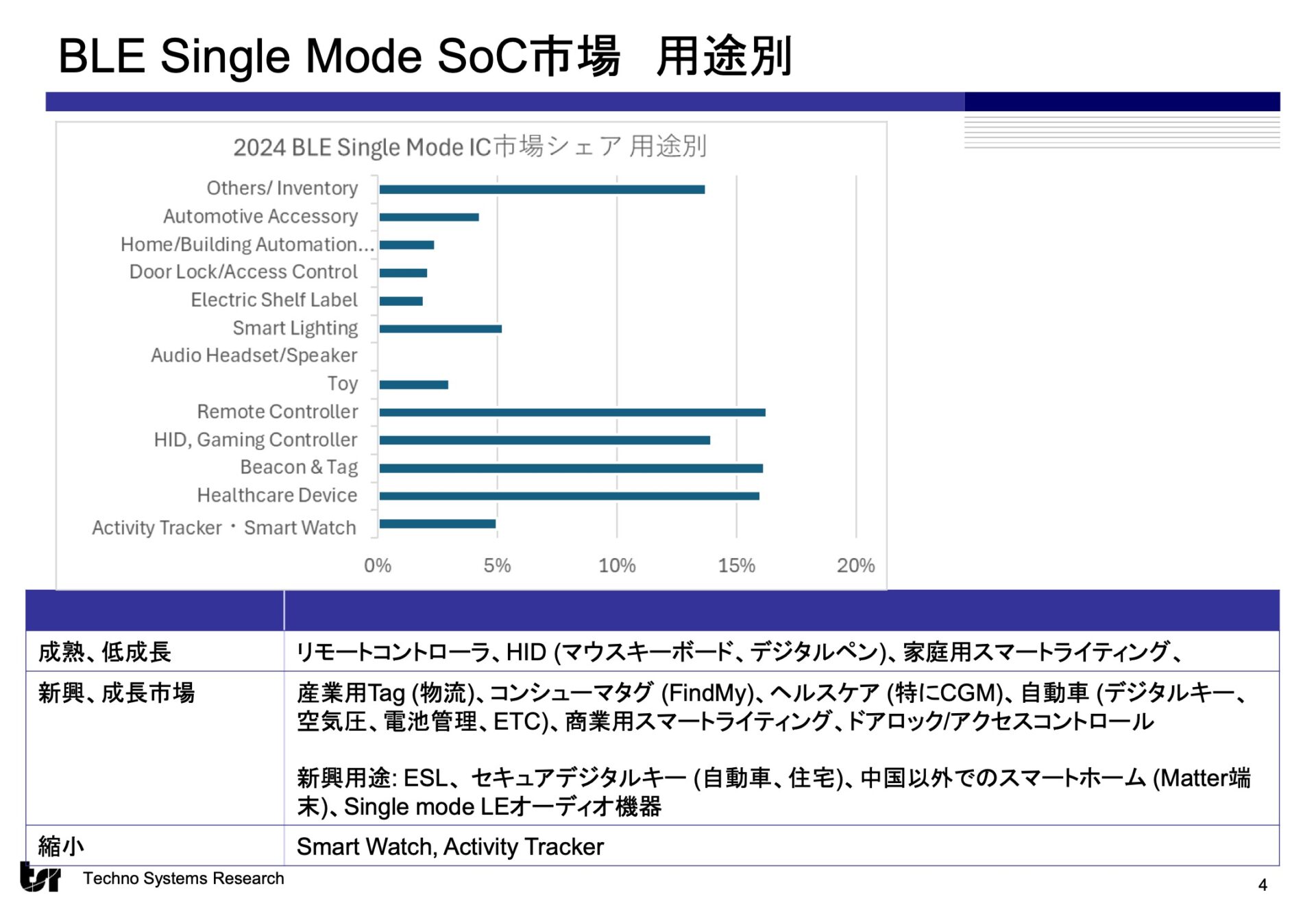 BLE Single Mode SoCの用途別内訳(成熟 / 成長 / 縮小)