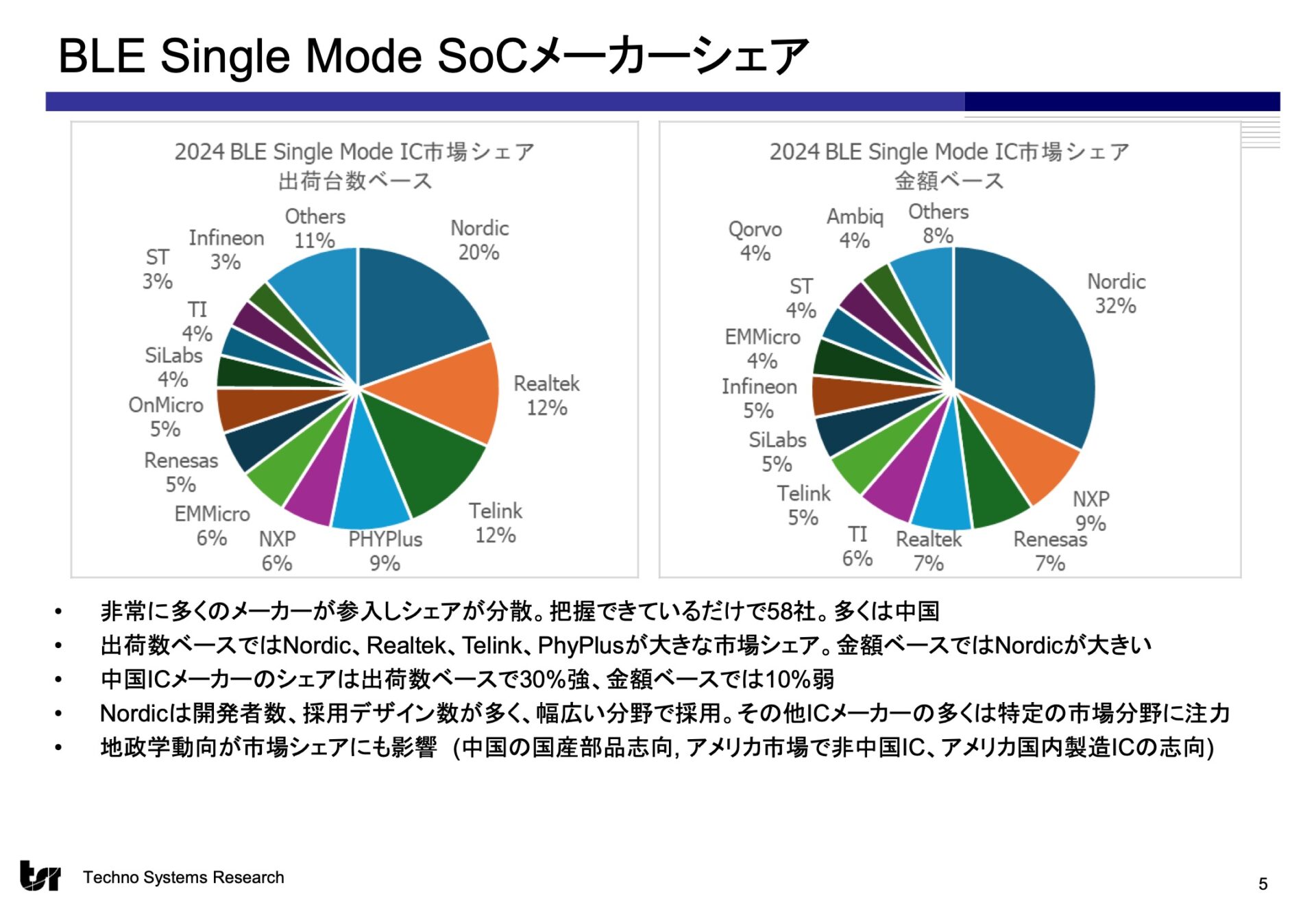 - Nordic Semiconductor社が出荷台数、金額ともにトップシェア。