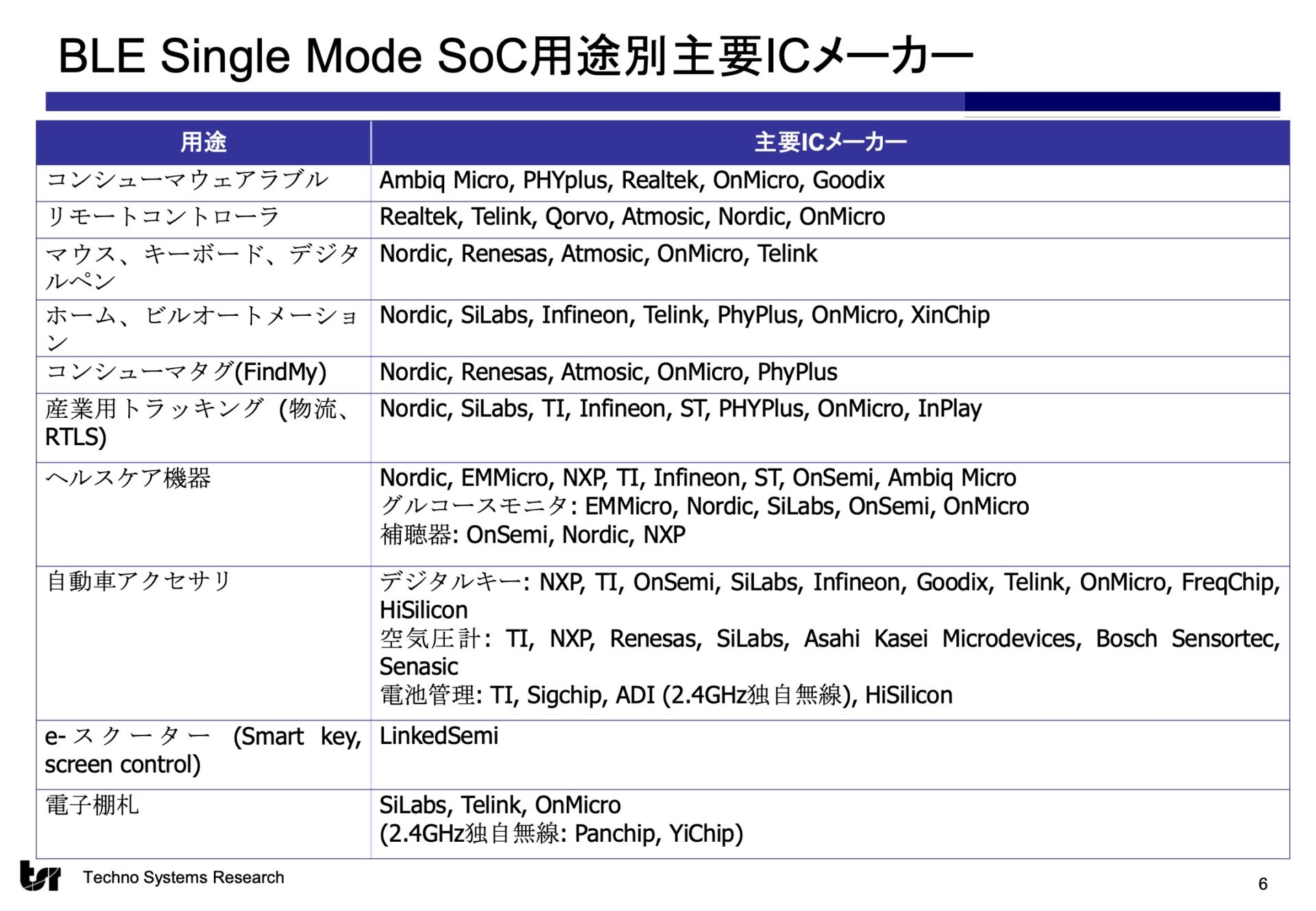 BLE Single Mode SoCの用途別主要ICメーカー一覧