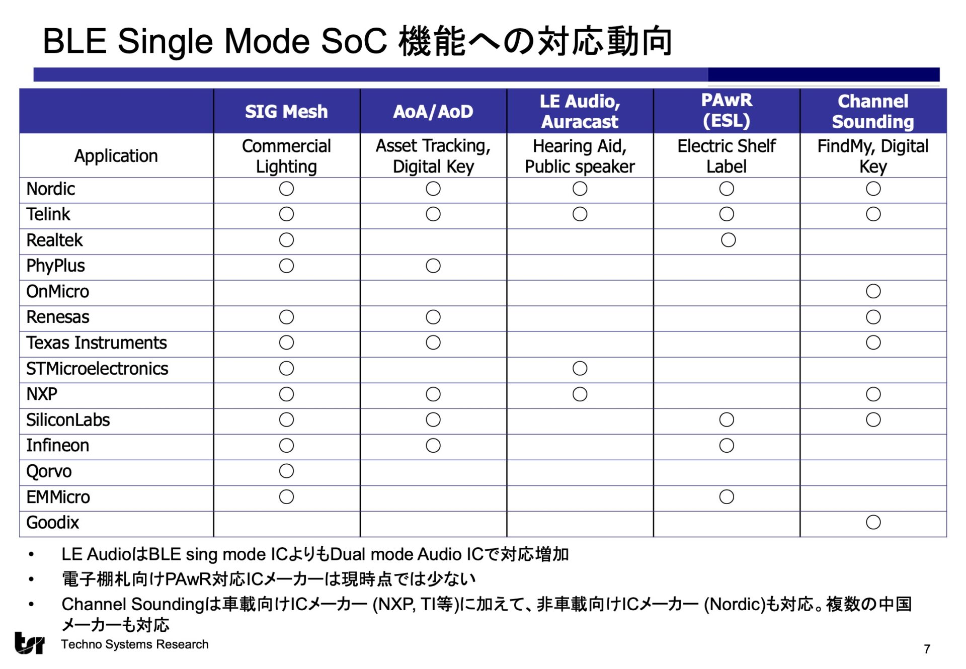 BLE Single Mode SoCメーカーの各Bluetooth機能への対応動向