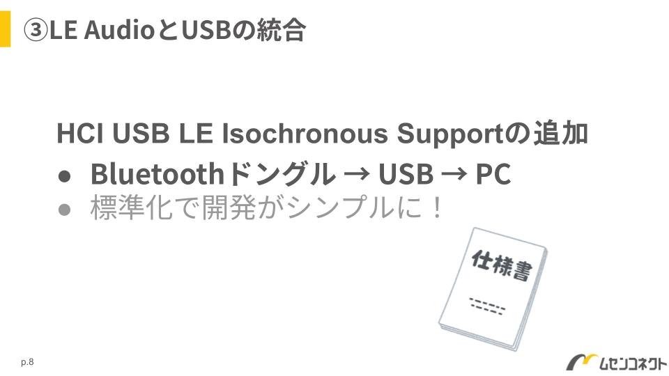 これまでは、BluetoothチップとホストPCをつなぐHCI通信に統一仕様がありませんでしたが、6.2で正式に規定されました。これにより、LE Audio対応のUSBドングル開発がずっと簡単になります。LE Audioの普及を後押しするアップデートですね。