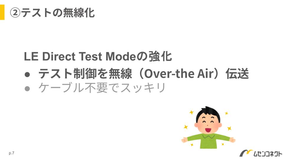 Bluetooth 6.2では、このテスト制御を無線(Over-the-Air)で行えるようになりました。つまり、Direct Test Modeをケーブルなしで実行できるようになり、テスト環境の自由度がグッと上がります。