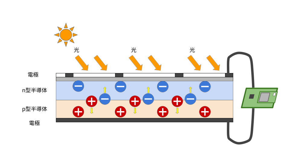 太陽光発電素子(ソーラーパネル)は、この原理を応用した光電変換素子で、屋外の太陽光だけでなく、室内の蛍光灯やLED照明のわずかな光でも発電が可能です。