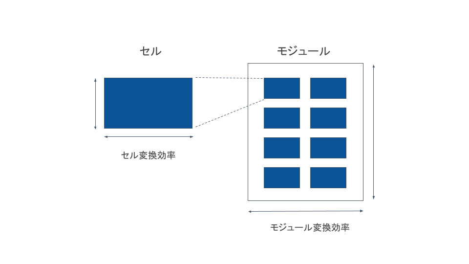 セルを並べてパネル化した太陽光発電素子の「製品状態」での発電効率です。発電に寄与しない部分も含めるため、セル変換効率よりも一段低い数値になるのが一般的です。