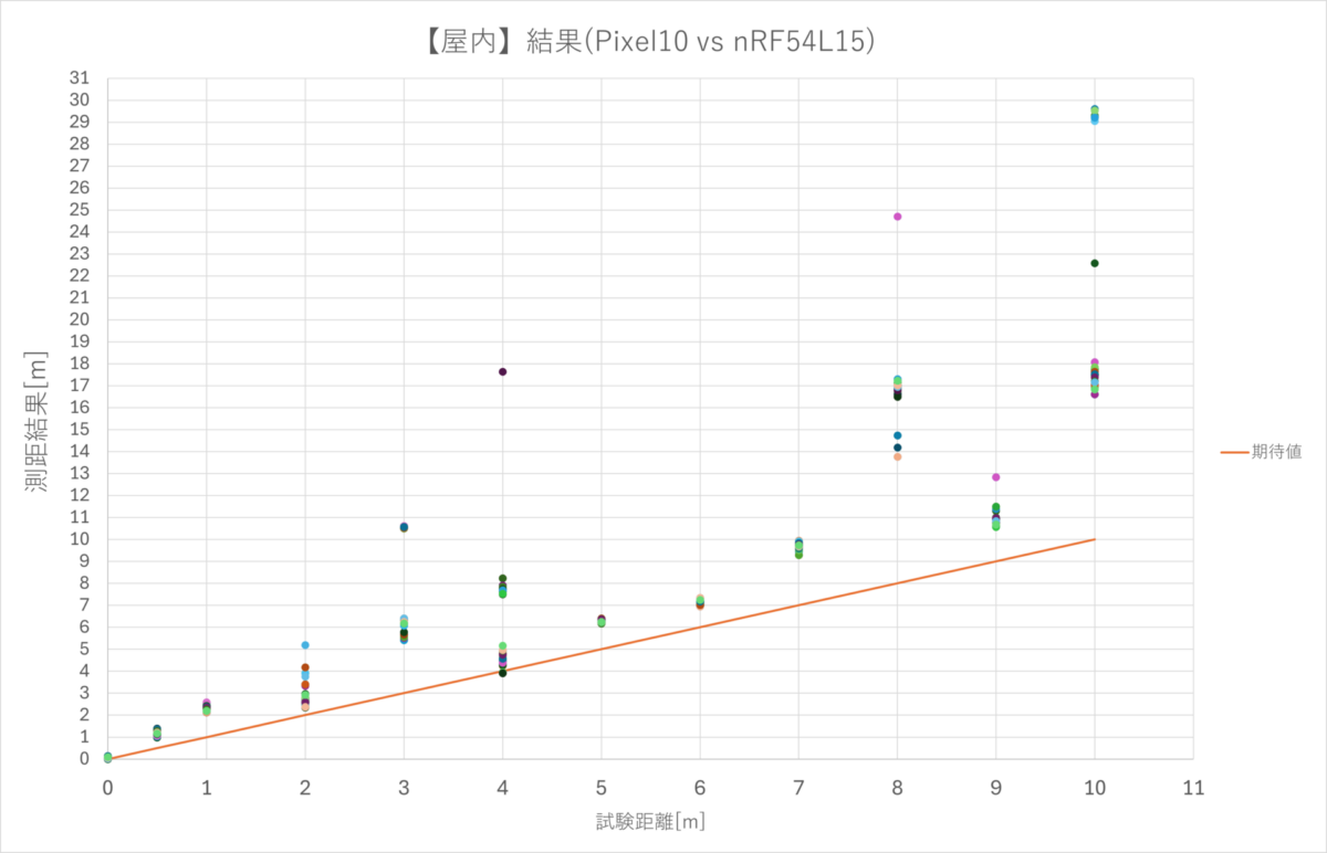 - 3m、4m、8m、10mでの測定結果が特に精度が悪く、測定試行毎のバラツキが大きくなっています。これは以前にnRF54L15 DK同士で実験したときにも同じような傾向でした。やはりマルチパス(反射波)の影響など環境要因によるものと考えられます。