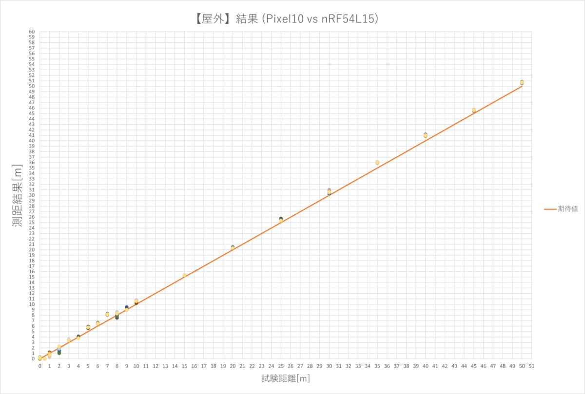 - 前回nRF54L15 DK同士で実験した時と比べてもバラツキが少なく精度が良いと思います。