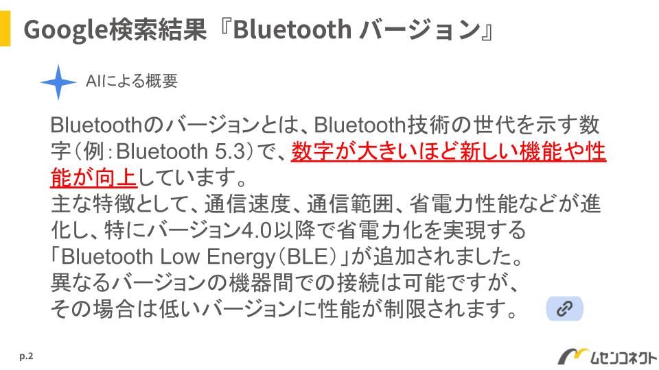 Googleで「Bluetoothバージョン」について検索してみると、AIによって以下のような概要が表示されます。