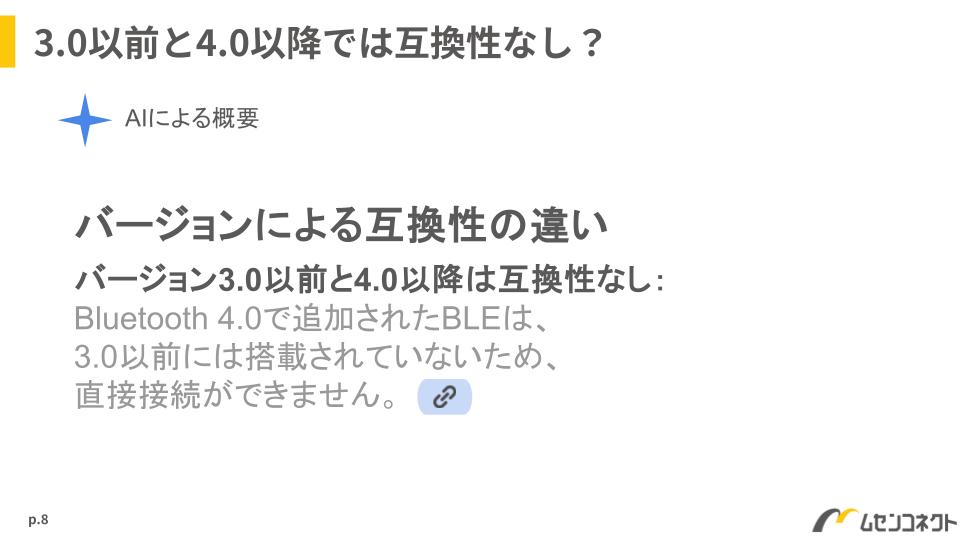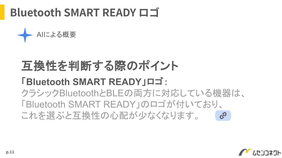 とても懐かしいロゴです。「Bluetooth SMART / SMART READY」は今から10年以上前にBluetooth SIGが提唱していたBluetoothの「規格名」ですが、今はもう使われていません。このようにAIは古い情報をそのまま拾ってしまうこともあります。