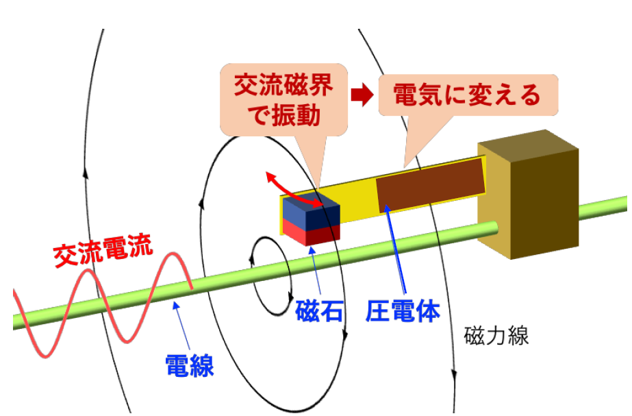 この磁界の変化に合わせてデバイス内の永久磁石が振動します。その振動エネルギーを「圧電セラミック」が電力に変換します。