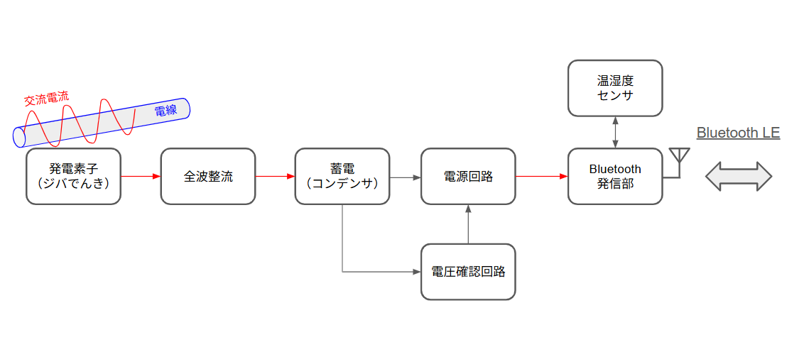 ジバでんきで発電した交流(AC)を直流(DC)に変換し、コンデンサに蓄電してBLEモジュールを駆動させる「間欠動作」の構成を採用しました。