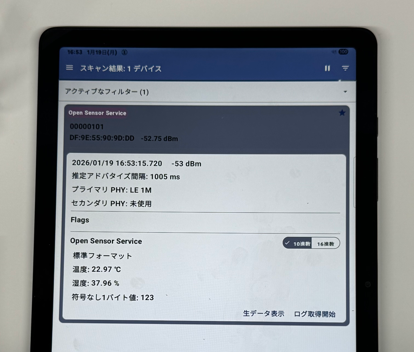 セラミックヒーターが稼働している間、スマートフォン上の検証アプリにて、センサーデータ(温度・湿度など)を含んだBluetooth LEアドバタイズパケットの受信に成功しました。
