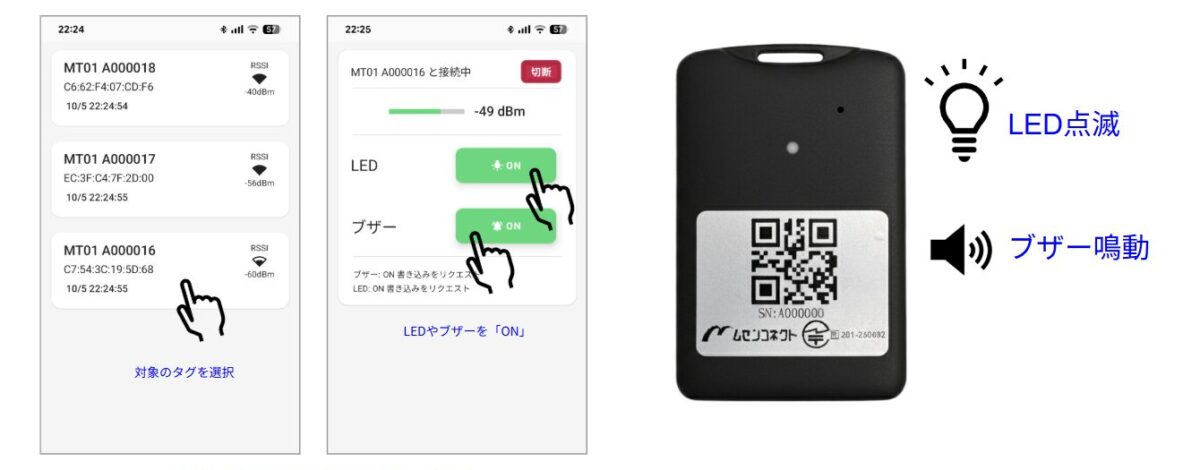 デモ用アプリから対象となるモノタグを選び、LED点滅とブザー鳴動を行った様子です。